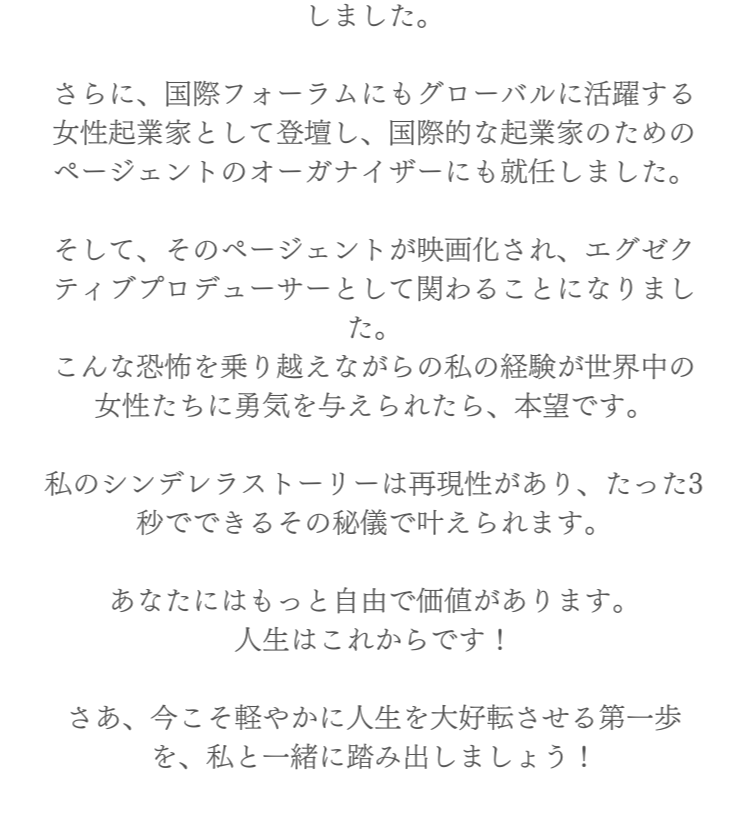 マインドと美のクラス受講し覚醒。名古屋から世界に活動を広げられた。夫婦仲で悩んでいたことも完全に克服できました。